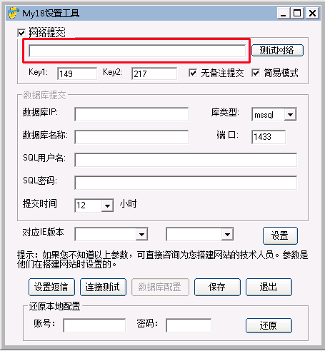 其中红框处的内容是保存提交数据的数据库路径,是可以自行修改的。 蓝框处的内容就是要转发到的网址,这个页面是需要自己编写的。这里我们提供了示例页面simp.asp和simp.php 绿框处是加密密钥,与设置工具中的key1,key2值对应.
